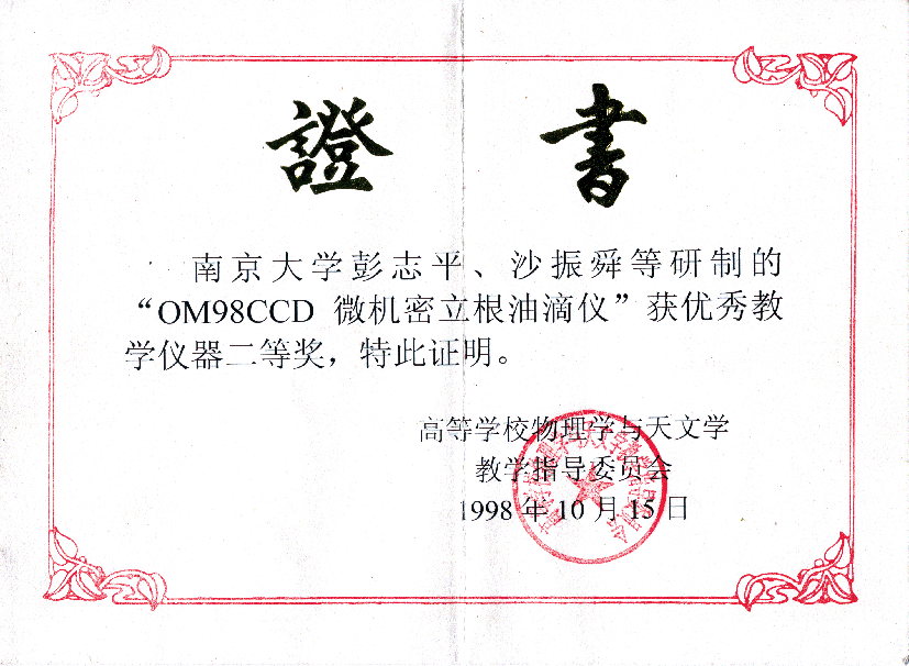 微机密立根油滴实验仪 荣获 江苏教育系统自制仪器评比三等奖(江苏省教育委员会)